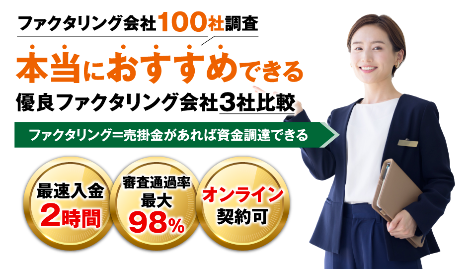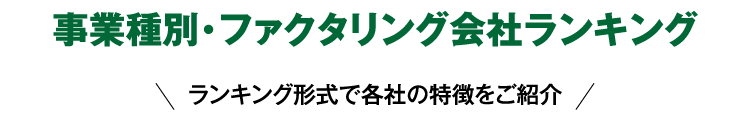 3年以上にわたり、100社近くあるファクタリング会社のリサーチおよび各社の社長や責任者の方とお会いしヒアリングの生情報を基に、厳選したファクタリング会社を紹介。※ファクタリング会社100社調査フッターに記載あり