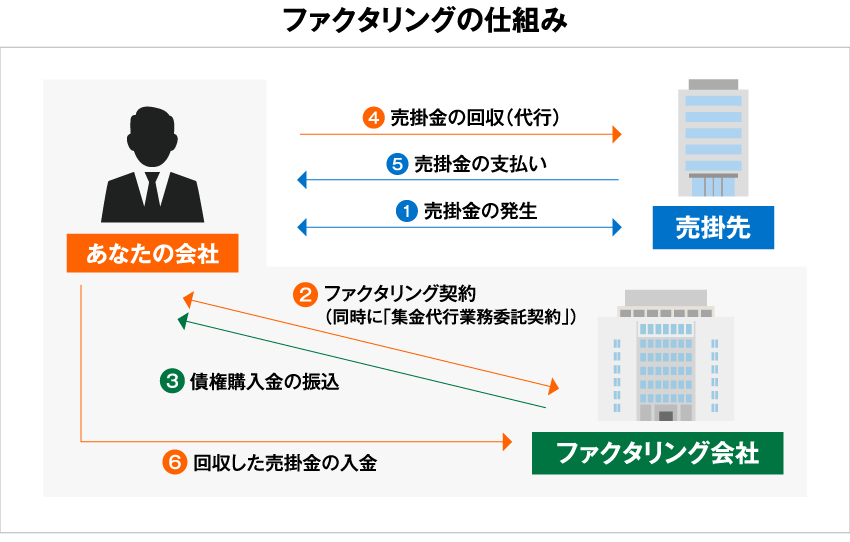 「ファクタリング」とは、事業者が保有している売掛債権等を期日前に一定の手数料を徴収して買い取るサービス(事業者の資金調達の一手段)であり、法的には債権の売買(債権譲渡)契約です。